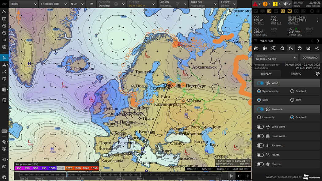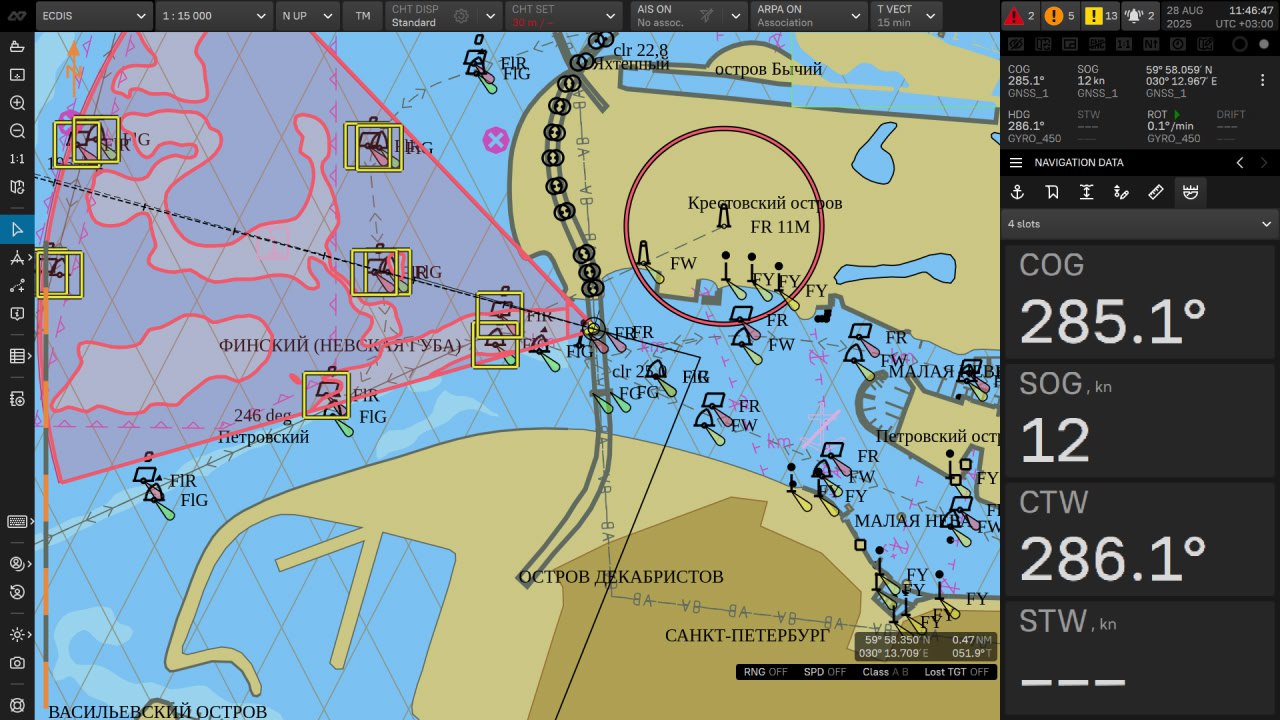 Система интегрирует навигационные карты, данные от судовых датчиков и оповещения в едином интерфейсе, предоставляя оператору полный обзор навигационной ситуации в реальном времени.